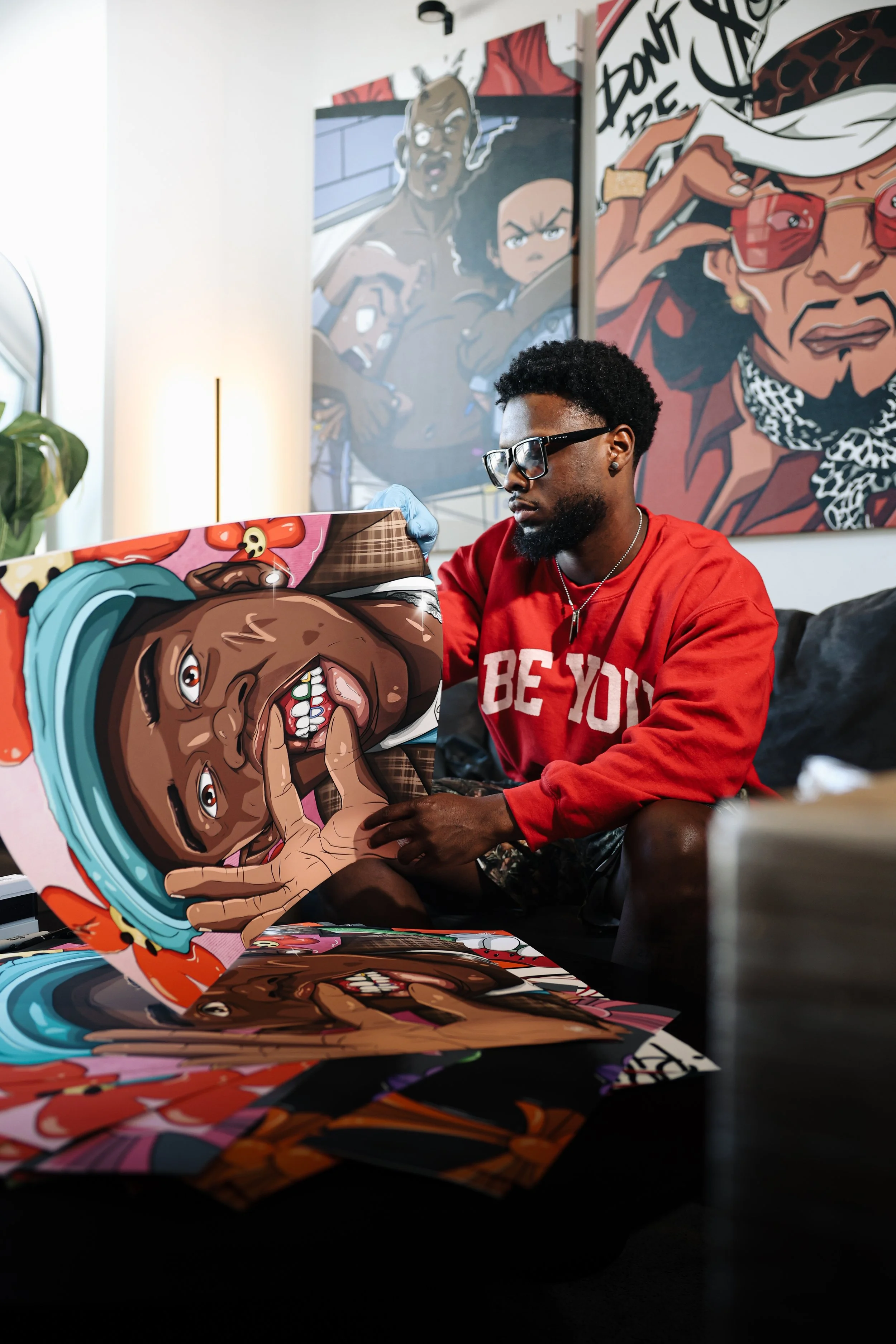Born and raised in Chicago, Amar’j was shaped by a lifelong love for cartoons, music, sports, and visual storytelling. He transformed what began as a personal artistic outlet into a thriving creative business. His signature pop-culture style - bold colors, layred meanings, and unapologetic self-expression quickly gained attention and evolved into curated canvas collections, merch capsules, and editorial-style photography.